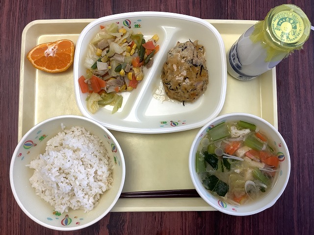 今日の給食のメニューは, ○麦ごはん ○ひじき入りつくね ○五目炒め ○さつまいもの味噌汁 ○ぽんかん ○牛乳 です。 今日のメインのおかずは,「ひじき入りの手作りつくね」です。ひじきの他にも,とり肉,豆腐,玉ねぎ,ごぼう,大豆,パン粉,たまご...