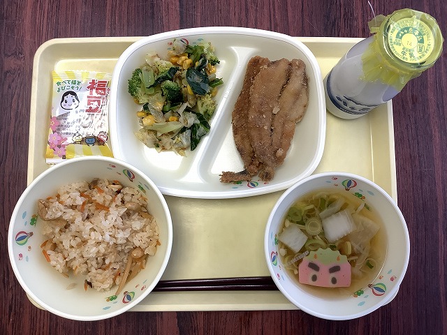 今日の給食のメニューは, ○やこめ ○いわしの竜田揚げ ○和風和え ○鬼かまぼこ入りのすまし汁 ○福豆 ○牛乳 です。 今日は「節分給食」を用意しました。「節分」とは,季節の変わり目の日のことです。節分の日は,悪いことを追い払う行事(豆まきなど... -