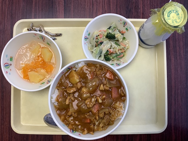 今日の給食のメニューは, ○チキンカレーライス ○いりこ ○かみかみサラダ ○クラッシュゼリー ○牛乳 です。 今日は,とり肉を使ったチキンカレーライスを用意しました。カレーライスは人気メニューの一つです。玉ねぎをしっかりと炒めることで,玉ね... -