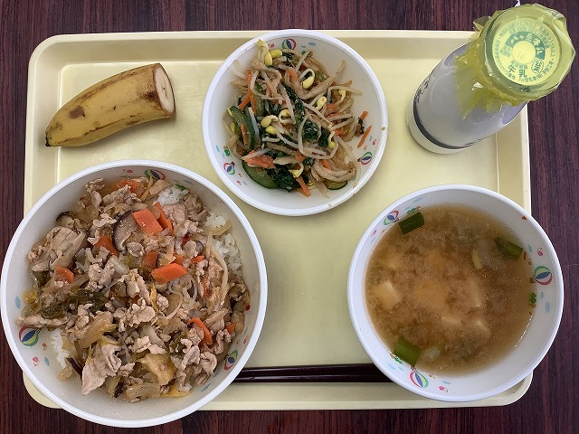 今日の給食のメニューは, ○豚キムチ丼 ○切り干し大根のナムル ○韓国風スープ ○バナナ ○牛乳 です。 今日は,「豚キムチ丼」を用意しました。「豚キムチ丼」に入っている豚肉には,疲れをとる働きのあるビタミンB1が多く含まれています。キムチは,... -